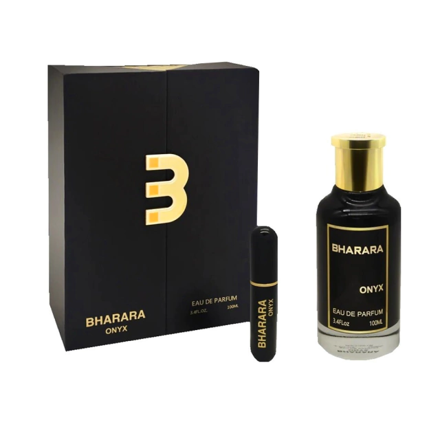 Bharara Onyx es una fragancia ambarada y amaderada para hombres y mujeres, conocida por su alta duración (más de 10 horas) y proyección potente. Destaca por una apertura cítrica-especiada (bergamota, pimienta negra), un corazón floral/inciensado (lavanda, rosa) y un fondo dulce-amaderado (vainilla, ámbar, oud)